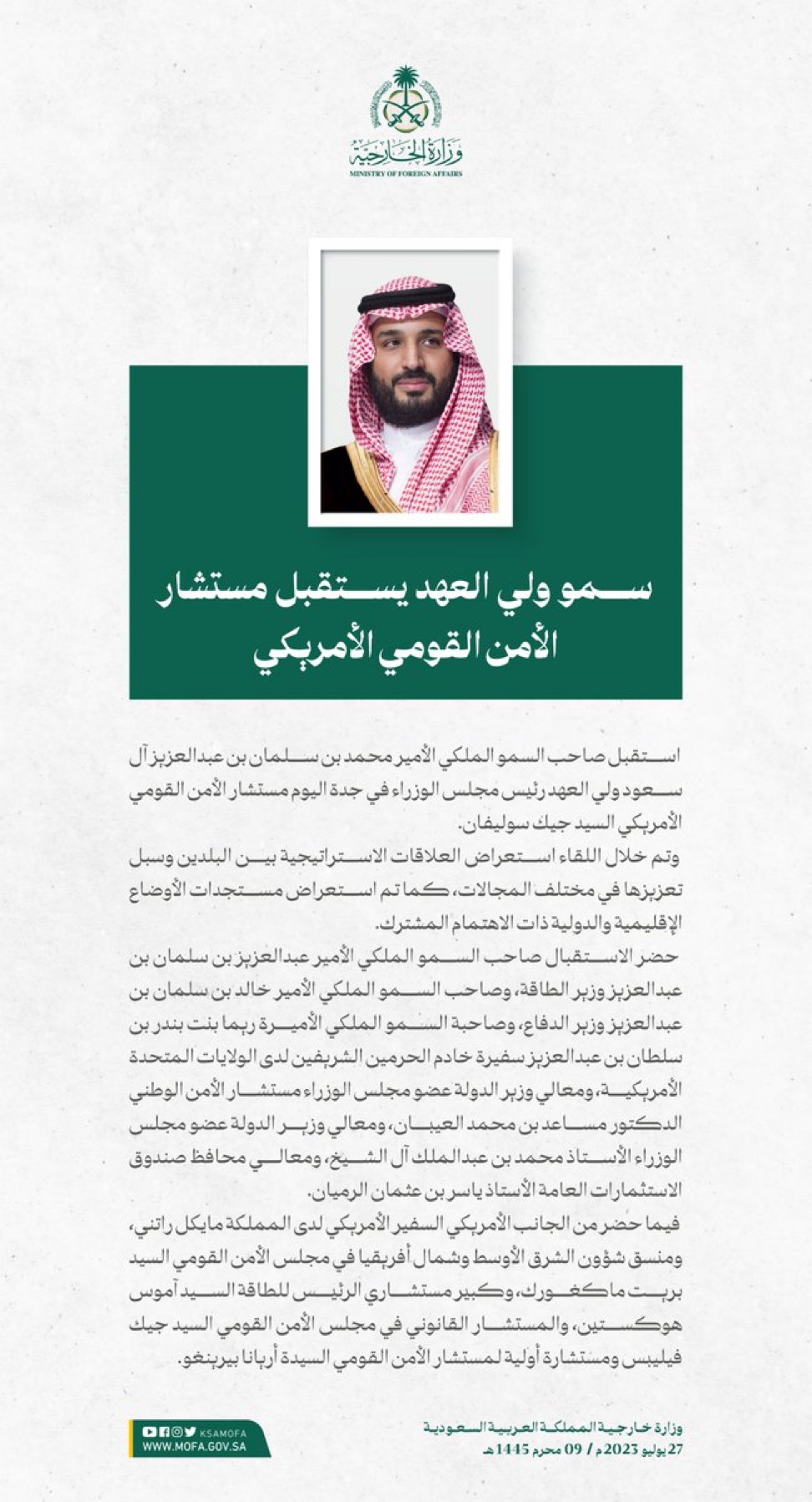 استقبل صاحب السمو الملكي الأمير محمد بن سلمان بن عبدالعزيز آل سعود ولي العهد رئيس مجلس الوزراء في جدة اليوم مستشار الأمن القومي الأمريكي السيد جيك سوليفان.