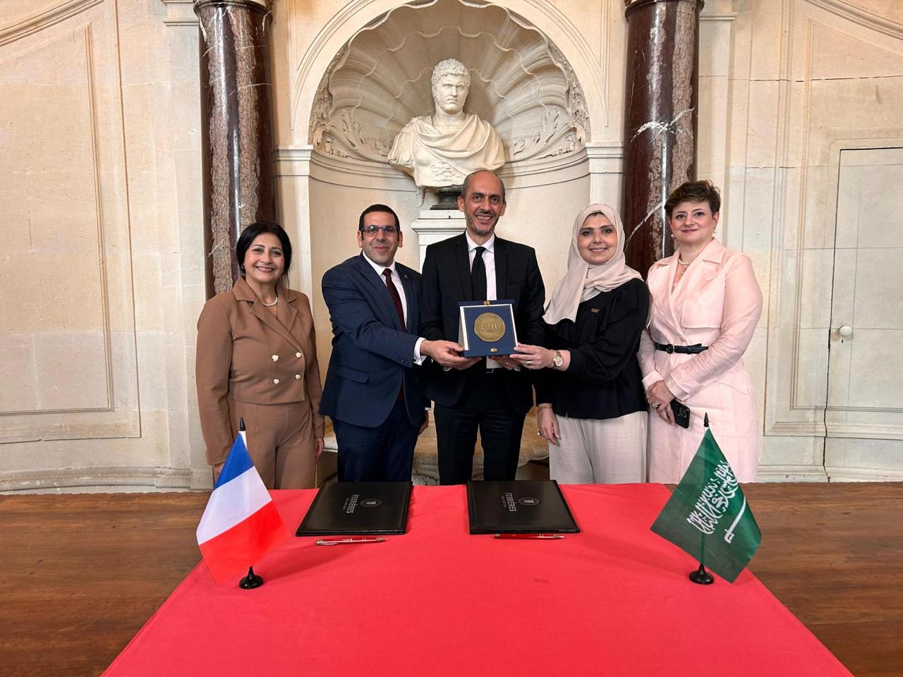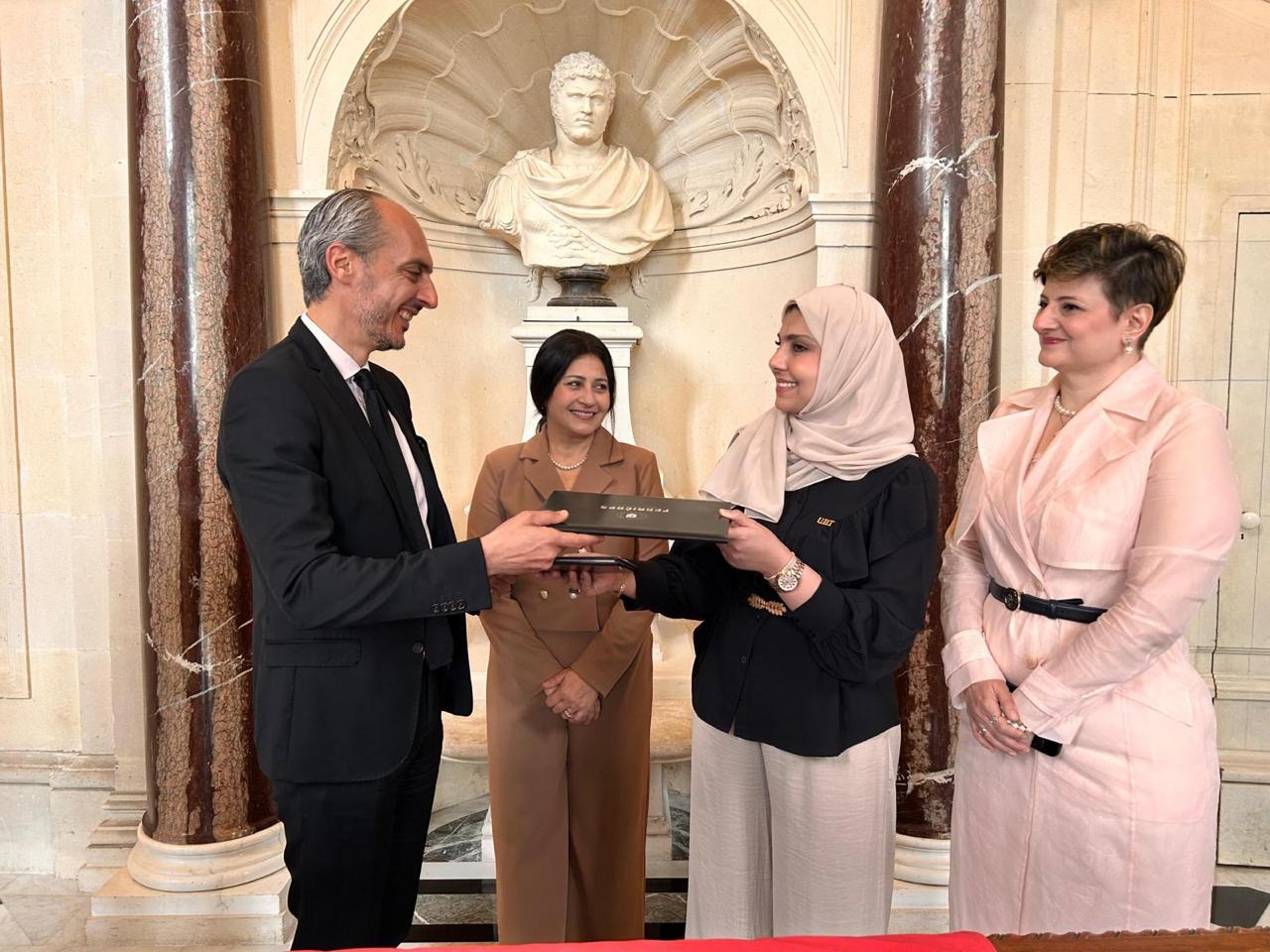 ‏وقد تم توقيع الاتفاقية ، اليوم ، في مقر الجامعة في  باريس  "قصر نابليون"، أحد المعالم التاريخية البارزة في العاصمة الفرنسية، حيث ترأست وفد الجامعة الدكتورة رمزية البكري، مساعد رئيس الجامعة لشؤون الطالبات وعميدة كلية إدارة الأعمال، بمشاركة كل من الدكتورة بسمة الزين، مسؤولة وادي التقنية، والبروفيسورة حنان جودة، مسؤولة العلاقات الدولية، حضور رسمي يعكس اهتمام الجامعة بتوسيع آفاق التعاون الدولي والارتقاء بجودة التعليم.