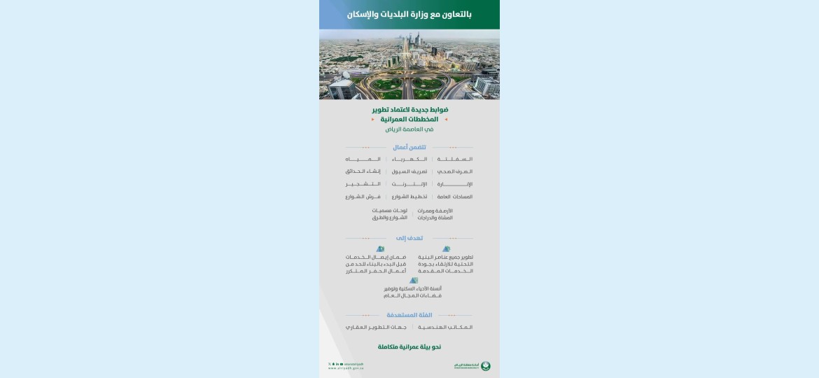 أقرت أمانة منطقة الرياض، بالتعاون مع وزارة البلديات والإسكان، حزمة من الضوابط والاشتراطات الجديدة لاعتماد  المخططات العمرانية  في العاصمة، التي تلزم المكاتب الهندسية والمطورين العقاريين باستيفاء كامل عناصر البنية التحتية والمجال العام قبل الشروع في أعمال البناء، وذلك في خطوة إستراتيجية تعكس تحولًا جذريًّا في منهجية التخطيط العمراني، وترسخ أسس الاستدامة وجودة الحياة في المدينة.