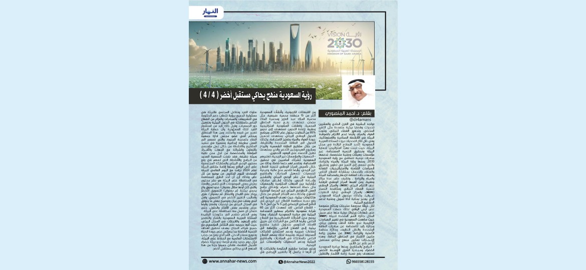 وفي الختام نتقدم الى حكومتنا الرشيدة المملكة العربية السعودية بالشكر والتقدير على الجهود والإنجازات في المجال البيئي، حيث أنها حريصة على التكامل المؤسسي مع جميع شركاء النجاح، بهدف تحقيق أهداف التنمية الشاملة بما ينعكس على جودة الحياة وتنويع مصادر الدخل، الأمر الذي يعزز من جذب الاستثمارات العالمية مع الحفاظ على البيئة، فكل يوم جديد يقدم فرصة نحو بيئة خضراء للأجيال القادمة، فلنكن جميعًا جزءًا من هذا المنهج الذي يحاكي مستقبل أخضر.