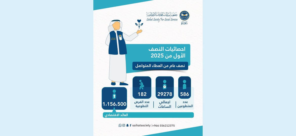 وبحسب الإحصائية بلغ عدد المتطوعين 586 متطوعًا ومتطوعة، قدّموا ما مجموعه 29,278 ساعة تطوعية، من خلال 182 فرصة تطوعية متنوعة خلال النصف الأول من العام.