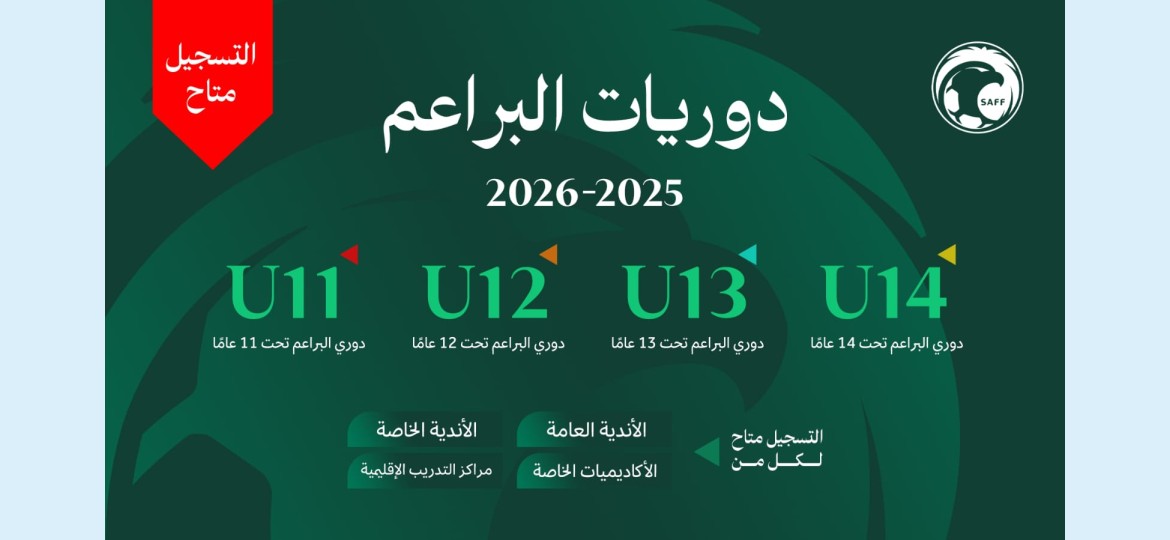 أعلن الاتحاد السعودي لكرة القدم فتح التسجيل للأندية العامة والخاصة والأكاديميات الخاصة ومراكز التدريب الإقليمية، في دوريات البراعم للفئات العُمرية مواليد 2011 فما فوق، لفئات تحت 11، 12, 13, 14 عامًا للموسم الرياضي الجديد 2025 ـ 2026.