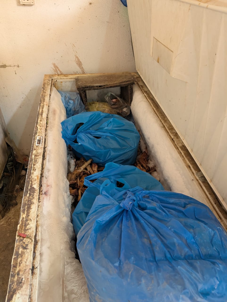 وأشارت إلى أن الموقع يفتقر إلى أي تراخيص نظامية، سواءً رخصة بلدية أو شهادة صحية أو سجل تجاري، كما تبيّن أن التيار الكهربائي موصل من مصدر مجهول، ويجري استخدام عدة ثلاجات كبيرة مشتركة لتخزين اللحوم في بيئة غير صحية.