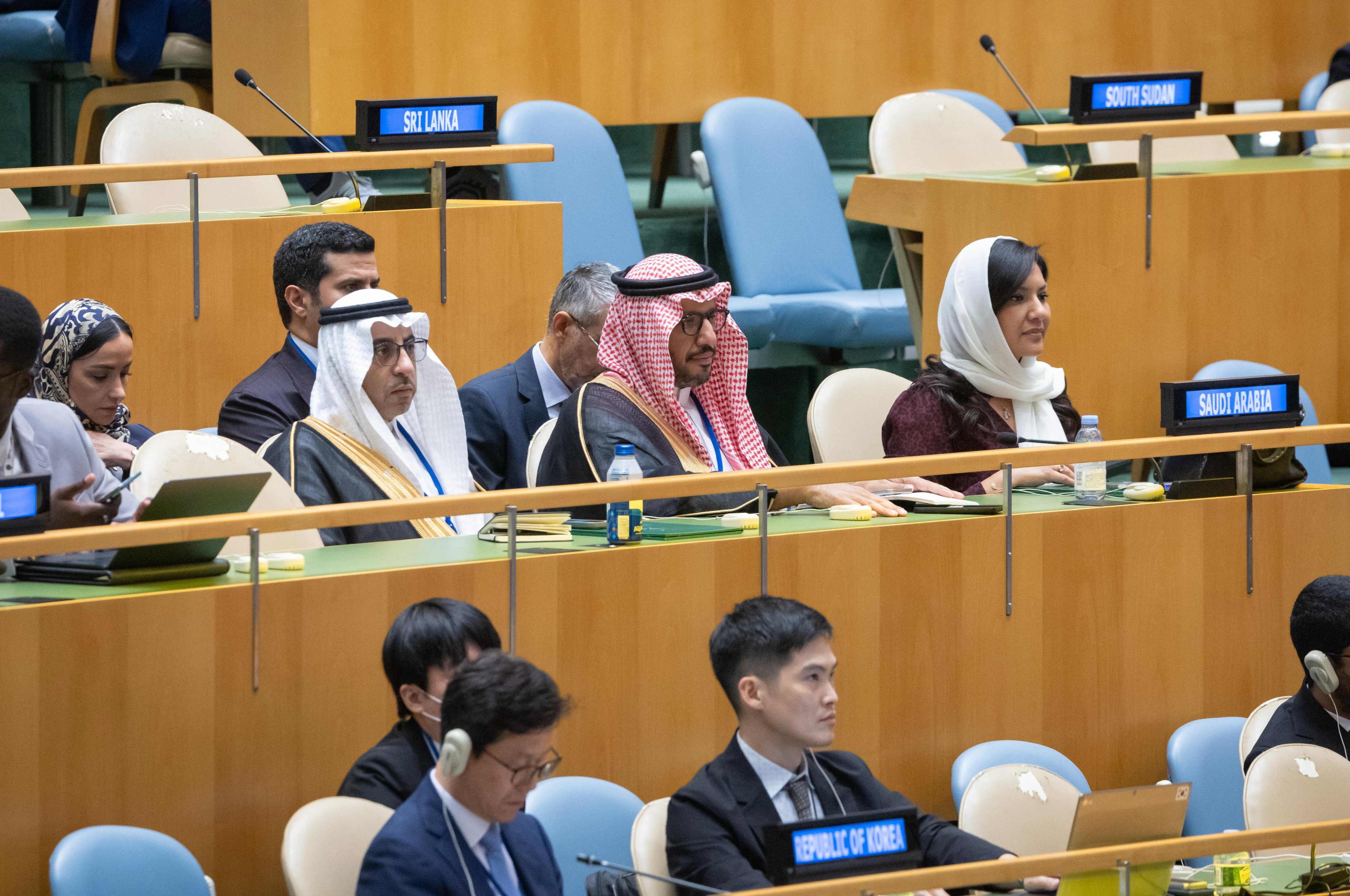 حضر الجلسة، صاحبة السمو الملكي الأميرة ريما بنت بندر بن سلطان سفيرة خادم الحرمين الشريفين لدى الولايات المتحدة الأمريكية، وسمو مستشار وزير الخارجية للشؤون السياسية الأمير مصعب بن محمد الفرحان، ووكيل الوزارة لشؤون الاقتصاد والتنمية عبدالله بن زرعة، ومندوب المملكة الدائم لدى الأمم المتحدة في نيويورك السفير الدكتور عبدالعزيز الواصل، ومستشار سمو وزير الخارجية محمد اليحيى، والوزير المفوض بوزارة الخارجية الدكتورة منال رضوان.