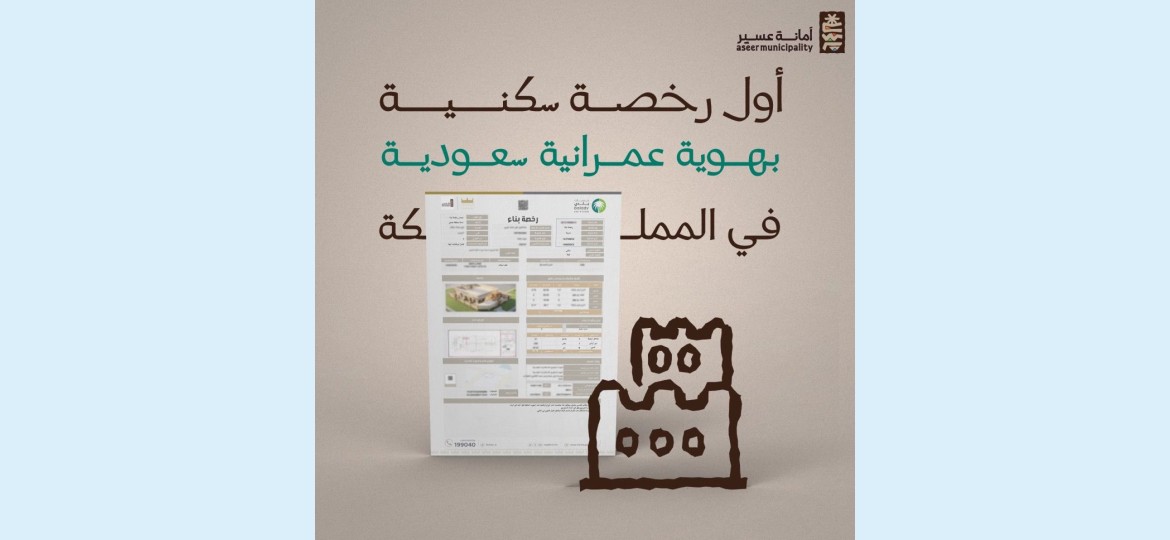 اصدرت أمانة منطقة عسير أول رخصة سكنية بالهوية العمرانية السعودية حيث تم منح الرخصة بناءً على اشتراطات العمارة السعودية والألوان الخاصة بالمنطقة حيث أن الموجهات العمرانية السعودية