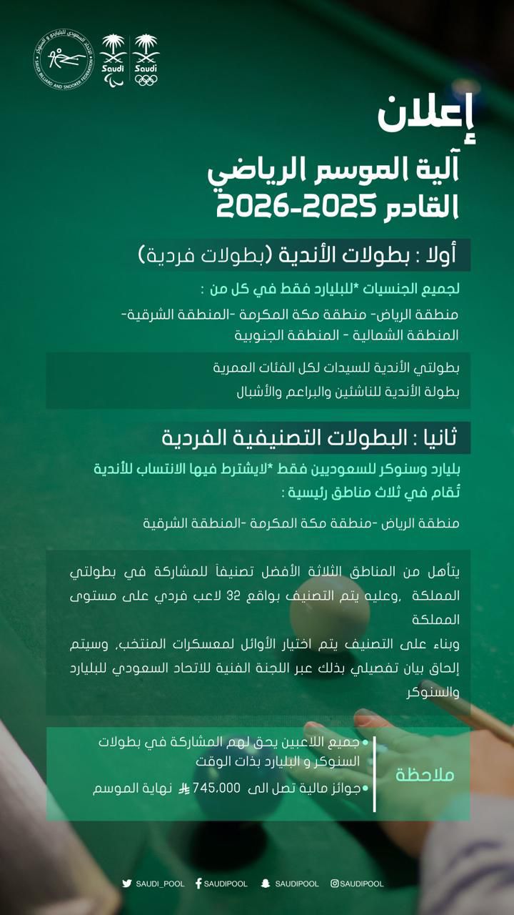 اعتمد الاتحاد السعودي للبلياردو والسنوكر آلية البطولات المحلية للموسم القادم 2025-2026، وستكون آلية البطولات على النحو التالي: