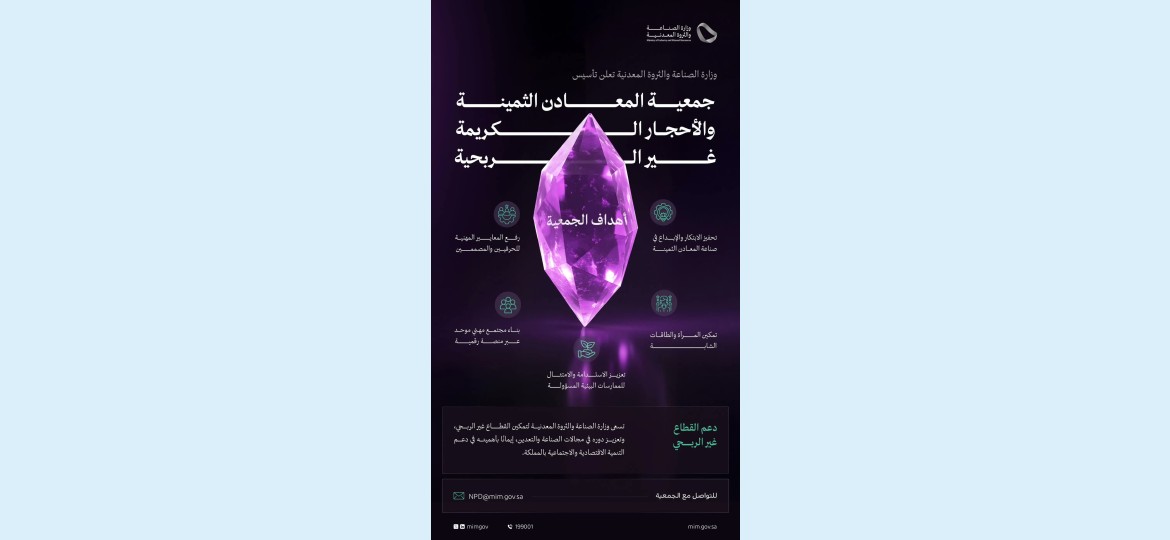 يُذكر أن تأسيس جمعية المعادن الثمينة والأحجار الكريمة غير الربحية؛ يأتي ضمن جهود وزارة الصناعة والثروة المعدنية لتمكين القطاع غير الربحي، وتعزيز دوره في مجالات الصناعة والتعدين