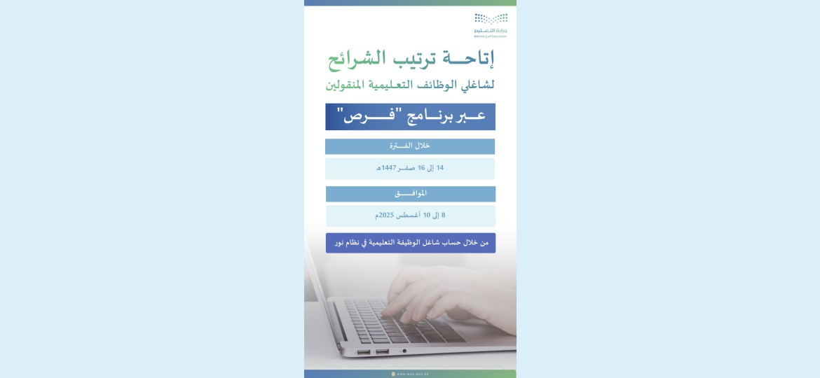 أعلنت الإدارة العامة للتعليم بمنطقة عسير عن فتح خدمة ترتيب الشرائح لشاغلي الوظائف التعليمية المنقولين عبر برنامج "فرص"، وذلك خلال الفترة من 14 إلى 16 صفر 1447هـ، الموافق 8 إلى 10 أغسطس 2025م.