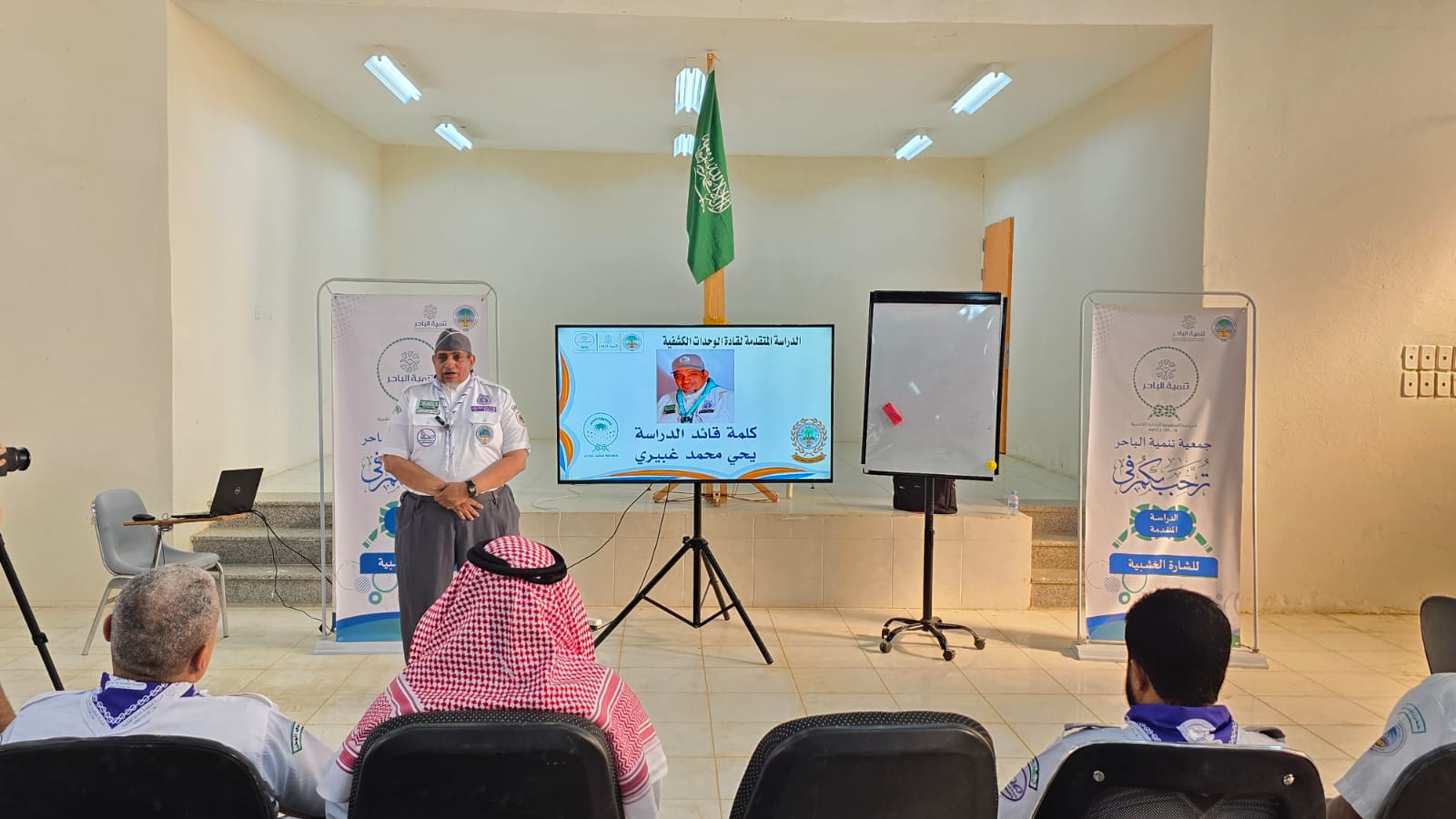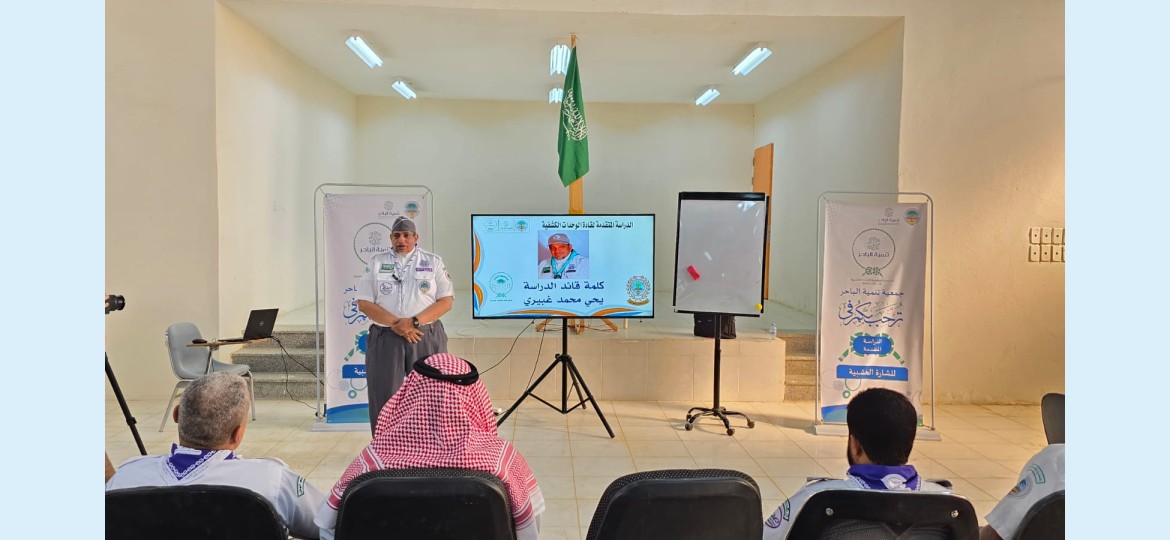 وألقى قائد الدراسة يحيى محمد غبيري كلمة في الحفل الخطابي الذي أقيم بمناسبة الافتتاح، قدم فيها الشكر لجمعية الكشافة على تنظيم تلك الدراسة، وأوضح فيها أن العمل الكشفي قائم على العمل التطوعي ، وأن كشافة المملكة تعمل وفق خطط استراتيجية بمختلف القطاعات على المساهمة البارزة في تحقيق رؤية المملكة 2030، وما تضمنته من طموح بتطوير العمل التطوعي ورفع نسبة عدد المتطوعين بما يتسق مع التطلعات العالمية بتعزيز العمل التطوعي وإسهاماته في التنمية على المستويات المحلية والوطنية والدولية لتحقيق الأهداف الإنمائية وأهداف التنمية المستدامة بالمملكة.