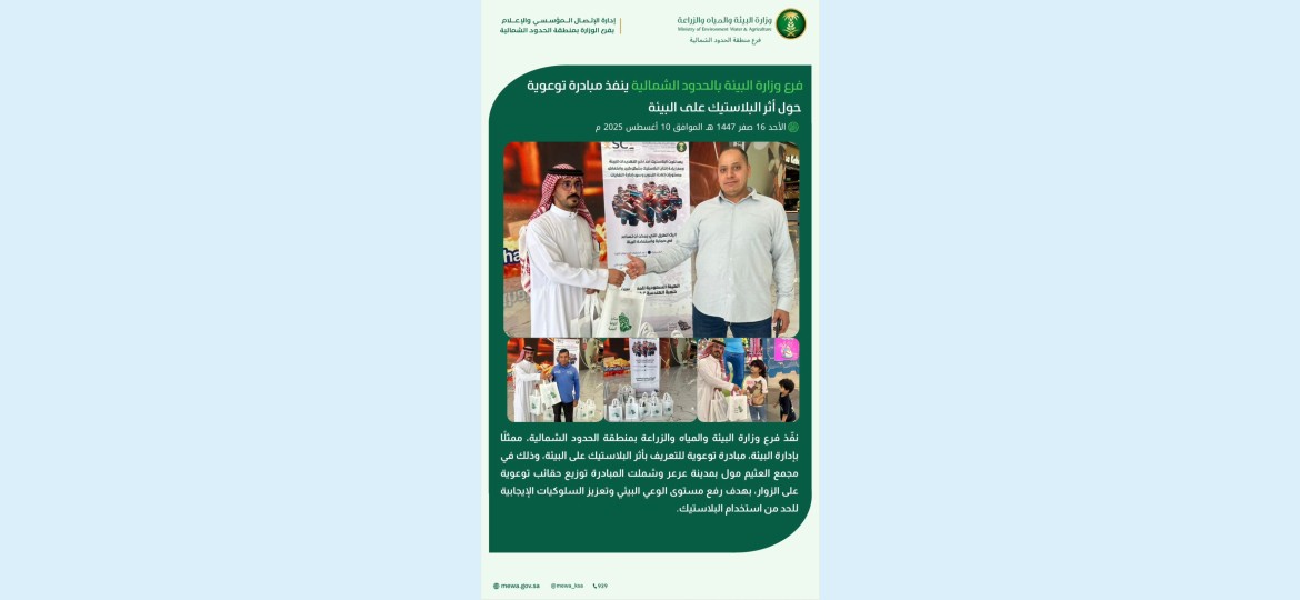 نفّذ فرع وزارة البيئة والمياه والزراعة بمنطقة الحدود الشمالية، ممثلًا بإدارة البيئة، مبادرة توعوية للتعريف بأثر البلاستيك على البيئة، وذلك في مجمع العثيم مول بمدينة عرعر وشملت المبادرة توزيع حقائب توعوية على الزوار، بهدف رفع مستوى الوعي البيئي وتعزيز السلوكيات الإيجابية للحد من استخدام البلاستيك.