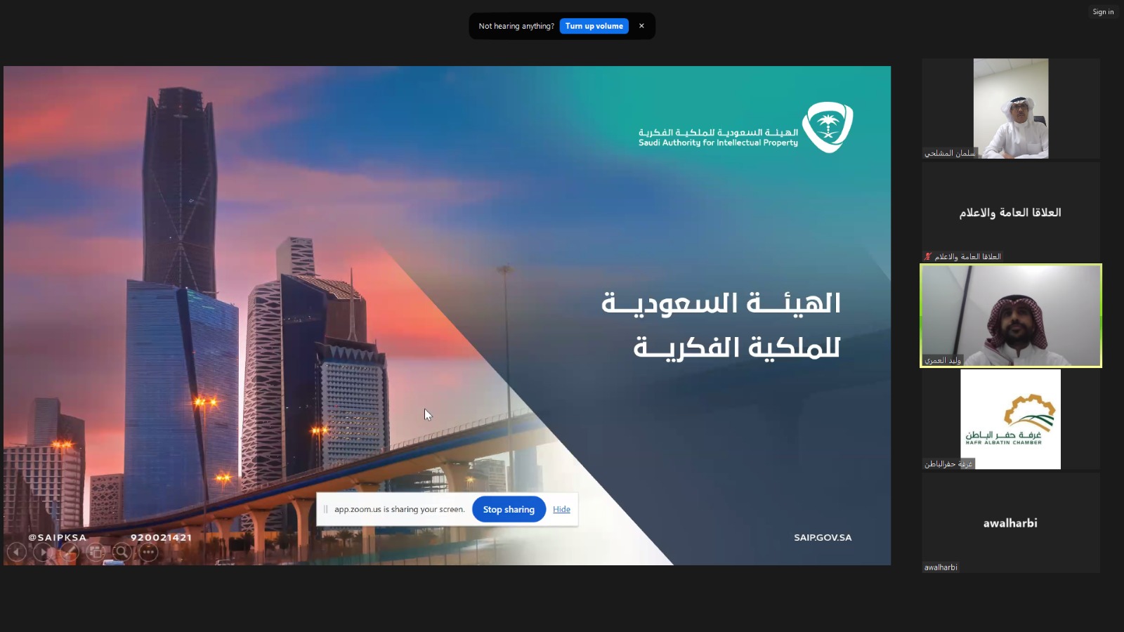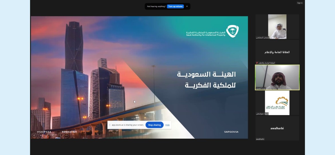 نظمت غرفة حفرالباطن بالتعاون مع الهيئة السعودية للملكية الفكرية، ورشة عمل افتراضية بعنوان "واقع الملكية الفكرية في المملكة، قدّمها الأستاذ وليد العمري، أخصائي دعم لجان نزاعات الملكية، وتناولت الورشة تاريخ الملكية الفكرية في المملكة، وأبرز المحطات التطويرية التي مر بها هذا القطاع الحيوي، إلى جانب أهميته في حماية الابتكارات والمنتجات الإبداعية.