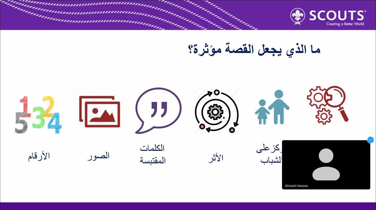 واشتملت الورشة، التي قدمها مدير إدارة المشروعات والمبادرات الخاصة، ومدير إدارة الاتصال سابقاً بالإقليم الكشفي العربي، أحمد حسن، على عدد من المحاور، تضمنت التعريف بالقصة القصيرة وعناصرها الأساسية وأنواعها ودورها الأدبي، وآليات بناء الفكرة والتخطيط، وتقنيات توليد الأفكار الجديدة، وسبل تطوير الحبكة من خلال أحداث مترابطة.