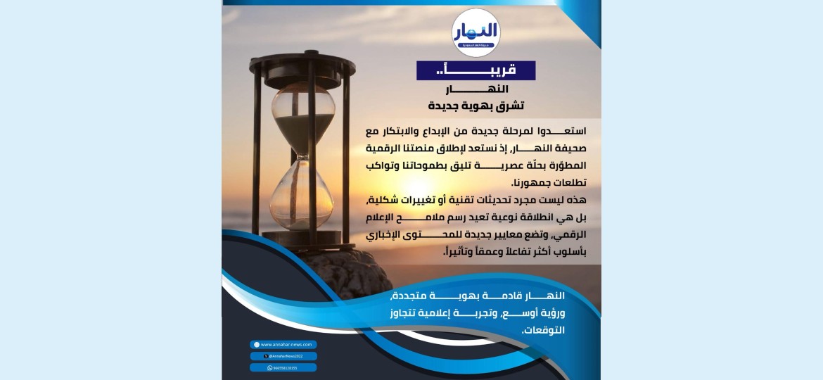 تستعد صحيفة النهار لانطلاقة نوعية جديدة تجمع بين الإبداع والابتكار، حيث تعلن قريباً عن إطلاق منصتها الرقمية المطوّرة بحلة عصرية تواكب تطلعات جمهورها، وتعكس طموحاتها في تقديم محتوى إعلامي متجدد وأكثر تأثيراً.