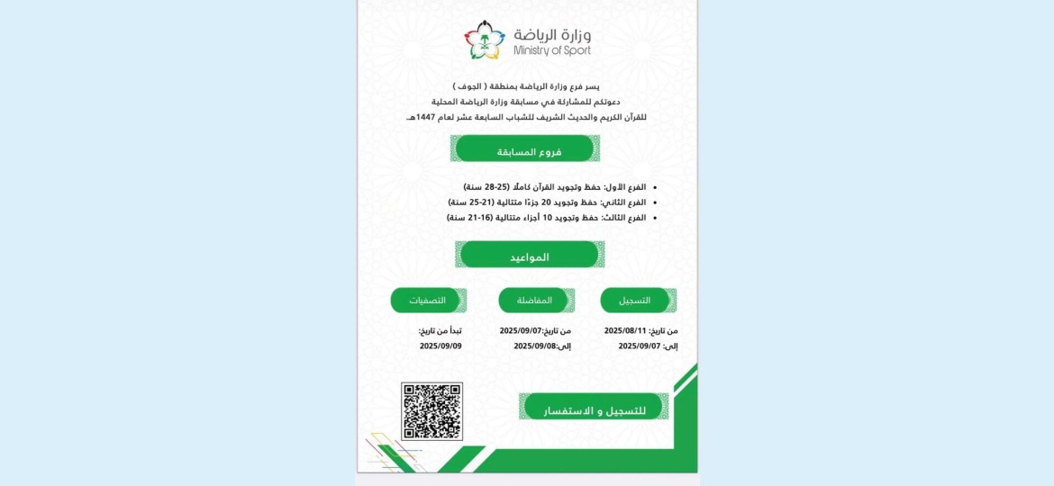 أعلن فرع وزارة الرياضة بمنطقة الجوف، عن فتح باب التسجيل لمسابقة الوزارة المحلية للقرآن الكريم والحديث الشريف للشباب السابعة عشر لعام 1447 هـ عبر 3 فروع هي: حفظ وتجويد القرآن كاملًا للفئة العمرية من 25 إلى 28 سنة، حفظ وتجويد 20 جزءًا متتالية للفئة العمرية من 21 إلى 25 سنة، حفظ وتجويد 10 أجزاء متتالية للفئة العمرية من 16 إلى 21 سنة.