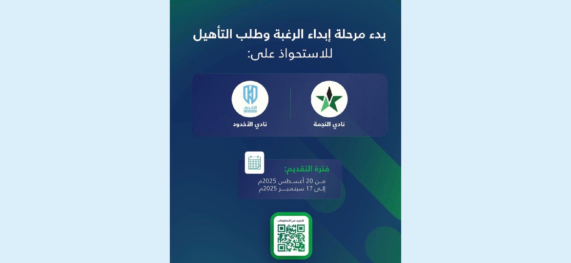 أعلنت وزارة الرياضة، وبالتعاون مع المركز الوطني للتخصيص، اليوم الأربعاء 20 أغسطس 2025م، بدء مرحلة إبداء الرغبة وطلب التأهيل للاستحواذ على ناديي النجمة والأخدود، استكمالًا لخطوات العمل المتواصلة، ضمن مشروع الاستثمار والتخصيص للأندية الرياضية، الذي يهدف إلى تعزيز مشاركة القطاع الخاص للاستثمار في القطاع الرياضي، بما يتماشى مع الأهداف الوطنية لرؤية السعودية 2030.