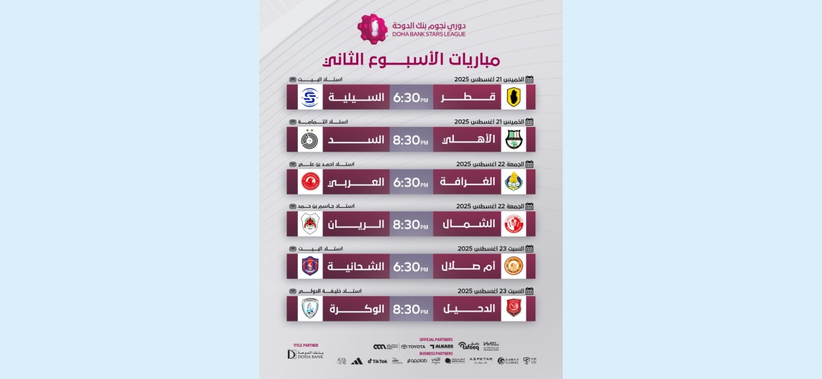 تتواصل منافسات الدوري القطري لكرة القدم بإقامة مباريات الجولة الثانية التي تنطلق غداً الخميس، وسط ترقب جماهيري كبير لما ستشهده من قمم منتظرة وصراعات مثيرة بعد البداية القوية والمفاجآت التي حملتها الجولة الافتتاحية.