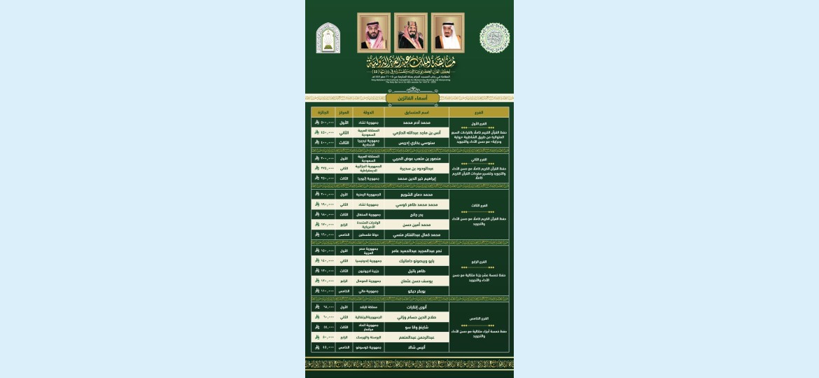 اعتمد معالي وزير الشؤون الإسلامية والدعوة والإرشاد الشيخ الدكتور عبداللطيف بن عبدالعزيز آل الشيخ، نتائج وأسماء الفائزين في مسابقة الملك عبدالعزيز الدولية لحفظ القرآن الكريم وتلاوته وتفسيره في دورتها الخامسة والأربعين، التي عُقدت في رحاب المسجد الحرام خلال الفترة 15 - 26 صفر لعام 1447هـ, بمشاركة (179) متسابقًا من (128) دولة من مختلف دول العالم تنافسوا على فروع المسابقة الـ(5), ويبلغ إجمالي الجوائز (4.000.000) ريال.