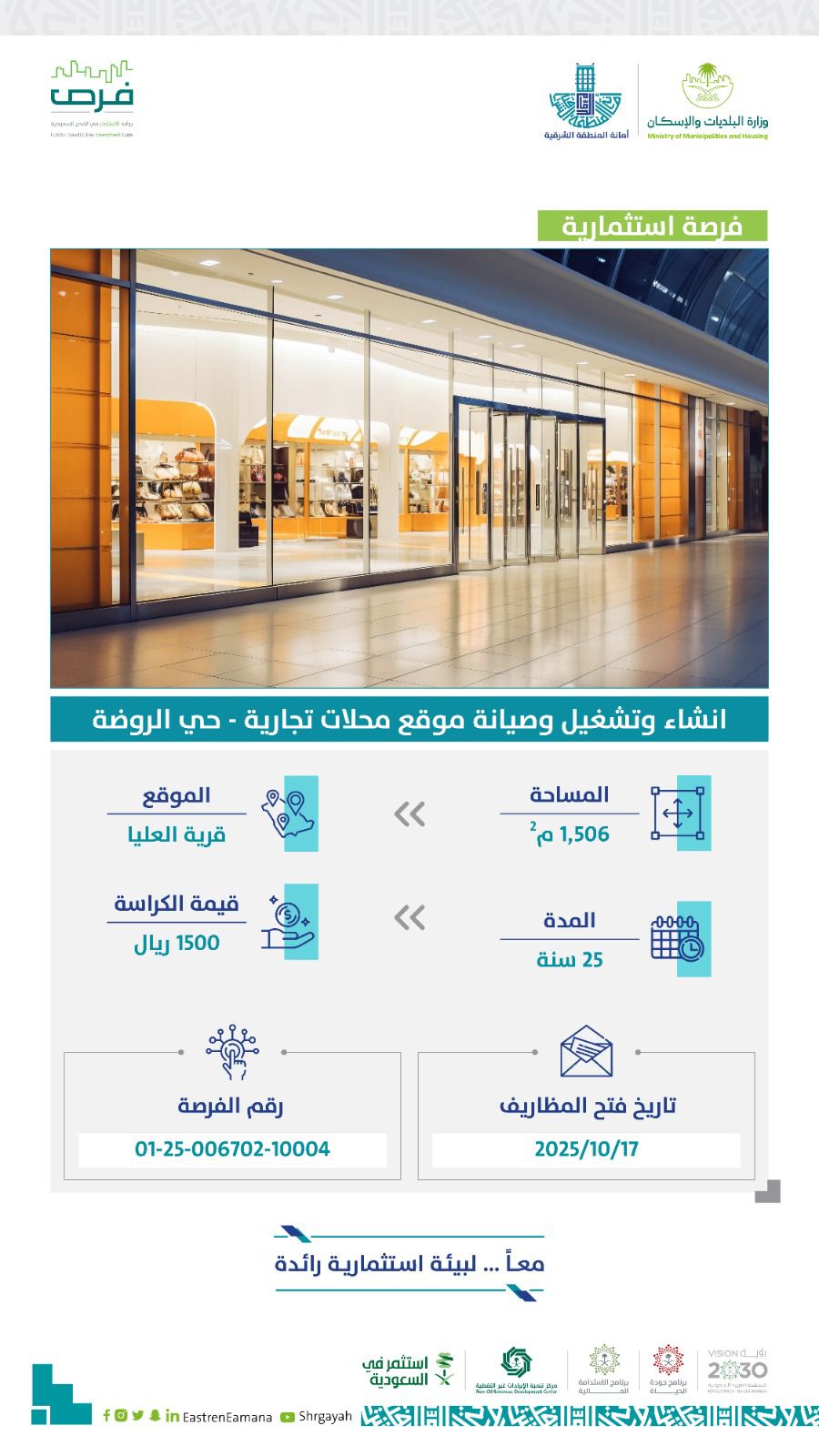 وتتضمن الفرص المطروحة ترميم وتشغيل وصيانة المركز الحضاري بمساحة مبنى تقارب 2,540 مترًا مربعًا وبمساحة إجمالية للموقع تبلغ 16,139 مترًا مربعًا، وذلك بعقد استثماري يمتد لمدة 25 عامًا، ليكون المركز وجهة حضارية متكاملة تقدم أنشطة متعددة وخدمات مساندة تلبي تطلعات المجتمع. كما تشمل الفرص إنشاء وتشغيل وصيانة محلات تجارية على مساحة تقدر بـ 1,500 متر مربع، بعقد مدته 25 عامًا، لتوفير وجهة تجارية حديثة تعزز الحركة الاقتصادية وتلبي احتياجات المستفيدين في المحافظة. إضافة إلى ذلك، تم طرح فرصة استثمارية لإنشاء وتشغيل وصيانة محلات تجارية وشقق مخدومة بمساحة تصل إلى 1,400 متر مربع وبعقد يمتد 25 عامًا، ليشكل مشروعًا متكاملًا يجمع بين الخدمات التجارية والسكنية، بما يسهم في دعم قطاعي الاستثمار والسياحة.