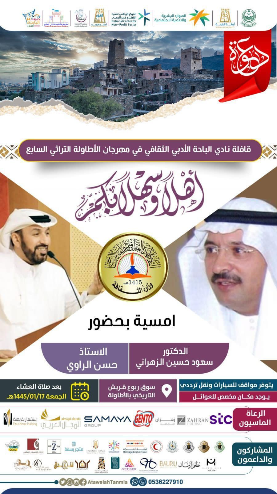 وصلت قافلة نادي الباحة الأدبي الثقافي الصيفية مساء اليوم ١٧ محرم ١٤٤٥الموافق٤ أغسطس ٢٠٢٣إلى محافظة القرى بالشراكة مع جمعية التنمية الأهلية بالأطاولة بمقر مهرجان الاطاولة التراثي