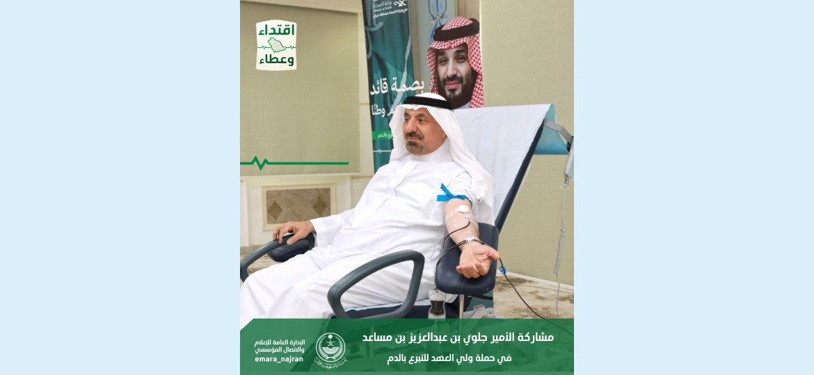 شارك صاحب السمو الأمير جلوي بن عبدالعزيز بن مساعد، أمير منطقة نجران اليوم، في الحملة التي أطلقها صاحب السمو الملكي الأمير محمد بن سلمان بن عبدالعزيز آل سعود ولي العهد رئيس مجلس الوزراء -حفظه الله- للتبرع بالدم.