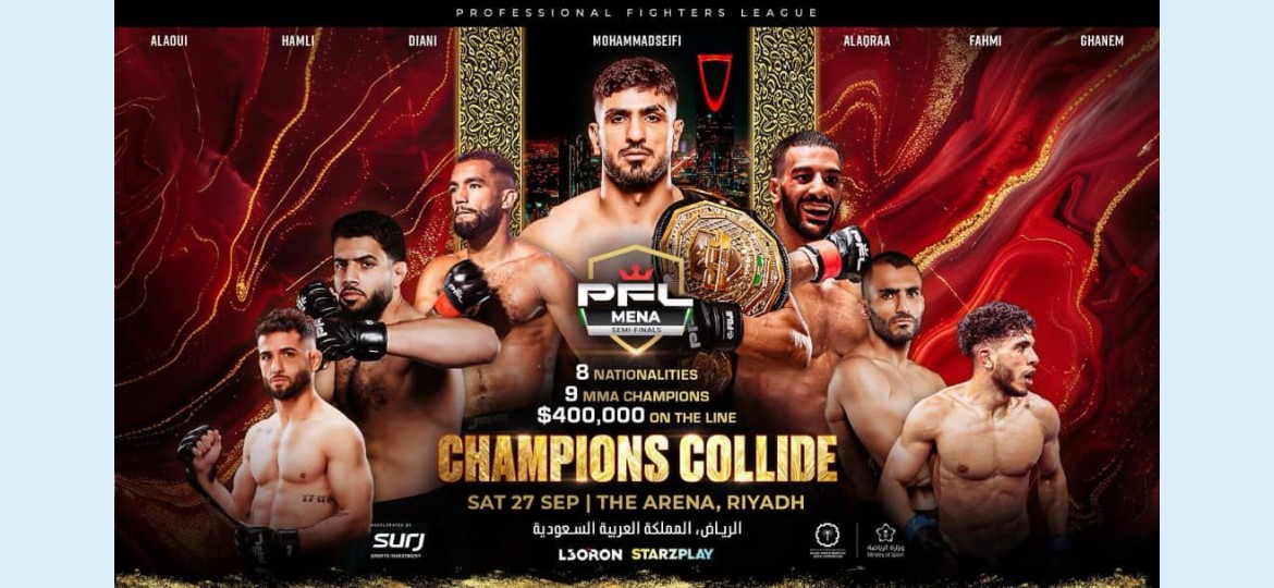 أعلنت رابطة الدوري الاحترافي للمقاتلين (PFL) عن تفاصيل بطولة نصف النهائي لمنطقة الشرق الأوسط وشمال أفريقيا تحت شعار «مواجهة الأبطال»، والتي ستُقام يوم السبت 27 سبتمبر المقبل في صالة ذا أرينا بالعاصمة الرياض، بمشاركة نخبة من أبرز المقاتلين على مستوى المنطقة.