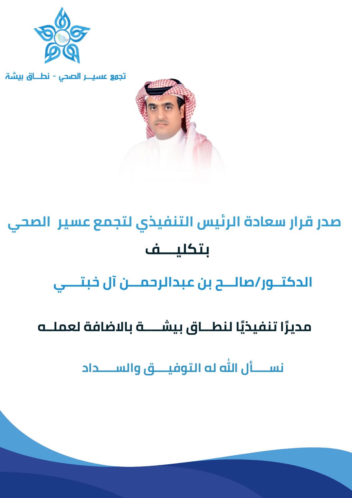 صدر قرار الرئيس التنفيذي لتجمع عسير الصحي بتكليف الدكتور صالح بن عبدالرحمن آل خبتي مديراً تنفيذياً لنطاق بيشة، وذلك بالإضافة إلى عمله السابق كمشرف عام على مستشفى الملك عبدالله ببيشة.