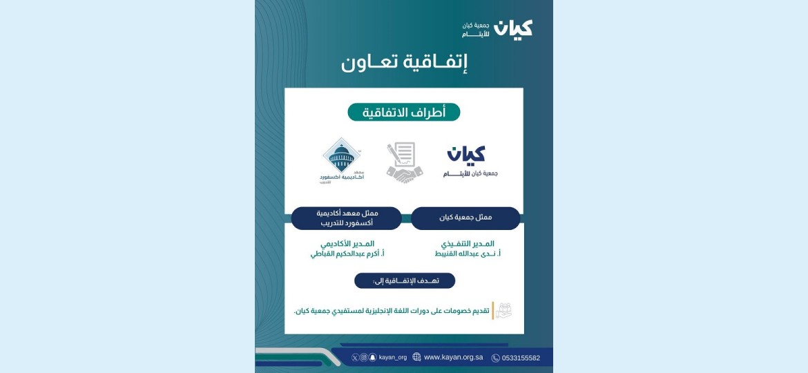 وتأتي هذه الاتفاقية في سياق تعزيز المسؤولية المجتمعية، حيث سيقدّم معهد أكسفورد خصومات مميزة على دوراته في اللغة الإنجليزية لمستفيدي جمعية كيان، مما يسهم في رفع كفاءتهم اللغوية، ويؤهلهم لفرص تعليمية ووظيفية أوسع.