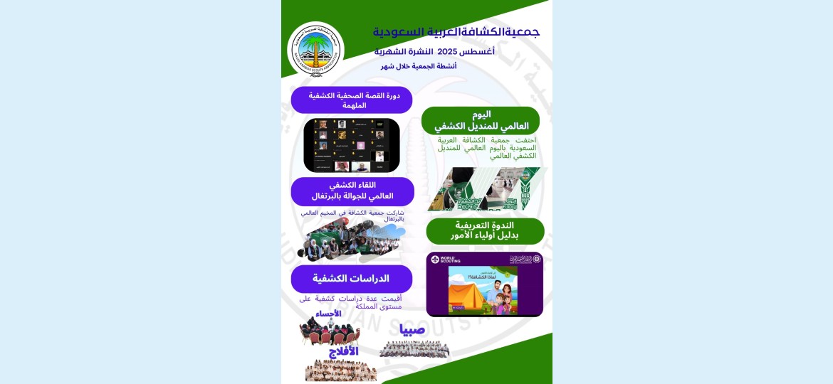 كشف تقرير إعلامي صادر عن أمانة جمعية الكشافة العربية السعودية عن تنفيذ ومشاركة الأمانة خلال شهر أغسطس 2025 في عدداً من الفعاليات والبرامج المتنوعة والمناسبات على المستويين المحلي والدولي.