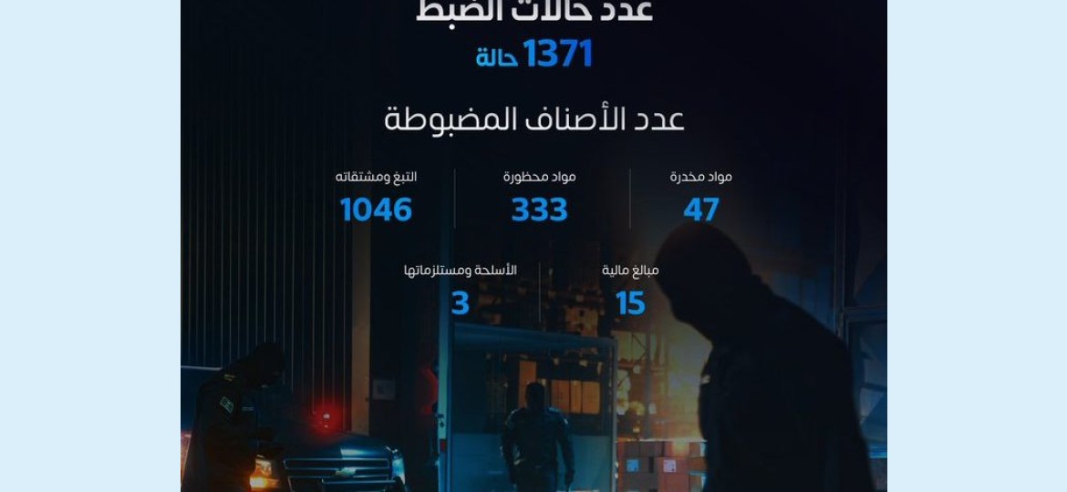 سجلت المنافذ الجمركية البرية والبحرية والجوية 1371 حالة ضبط للممنوعات، وذلك في إطار الجهود المستمرة التي تبذلها هيئة الزكاة والضريبة والجمارك "زاتكا" لتعزيز الجانب الأمني وحماية المجتمع من الممنوعات بمختلف أنواعها وأشكالها.