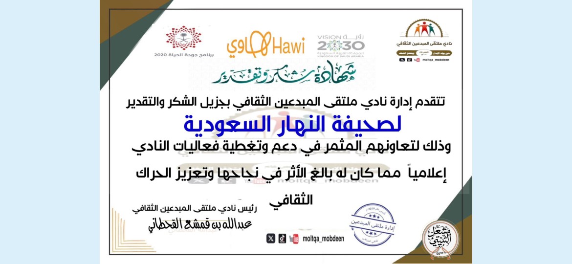 قدّم نادي ملتقى المبدعين الثقافي شهادة شكر وتقدير إلى صعيفة النهار السعودية، وذلك تثمينًا لجهودها الإعلامية في دعم وتغطية فعاليات النادي.