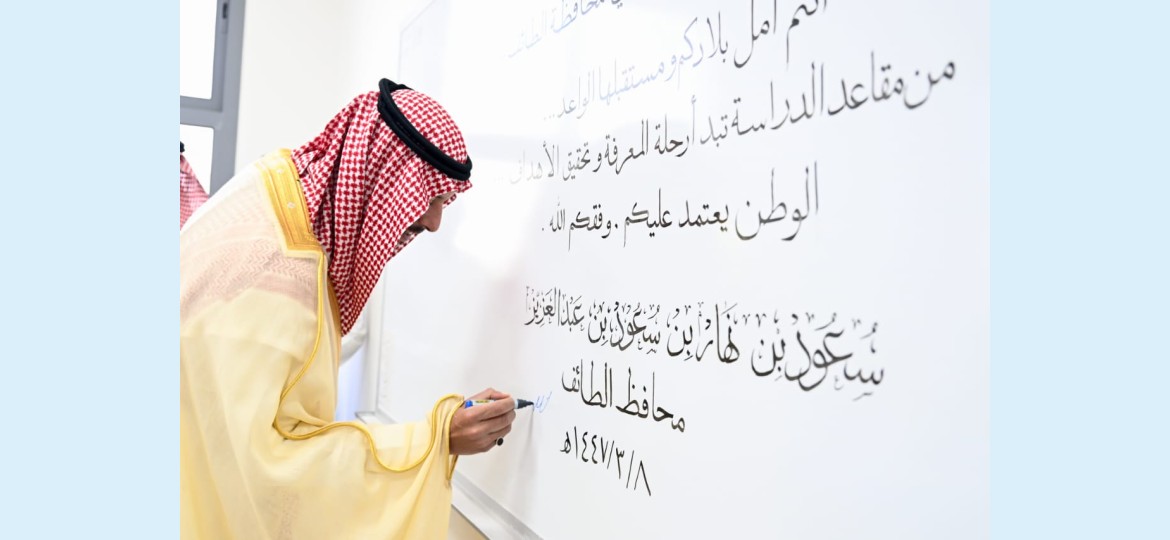 دشن  صاحب السمو الملكي الأمير سعود بن نهار بن سعود بن عبدالعزيز محافظ الطائف  ، انطلاقة  العام الدراسي الجديد 1447هـ  صباح اليوم الأحد وافتتح برنامج الأسبوع التمهيدي والتهيئة الإرشادية بمدارس المحافظة   ، وشارك أبنائه الطلاب يومهم الدراسي  وشهد  توزيع الكتب على الطلاب  بحضور  مساعد وزير التعليم  المهندس محمد بن ناصر الغامدي و المدير العام للتعليم  بالطائف  الدكتور سعيد بن عبدالله الغامدي  وذلك بمقر مجمع القلت التعليمي