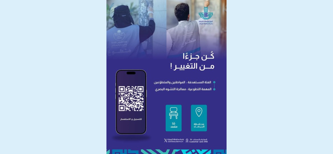 أطلقت بلدية محافظة البيضاء، مبادرة تطوعية بعنوان "المشاركة في الرقابة"، تستهدف سكان المحافظة من المواطنين والمقيمين، وتركز بشكل مباشر على إزالة الملصقات العشوائية التي تُعد من أبرز مظاهر التشوه البصري في الشوارع والأحياء.