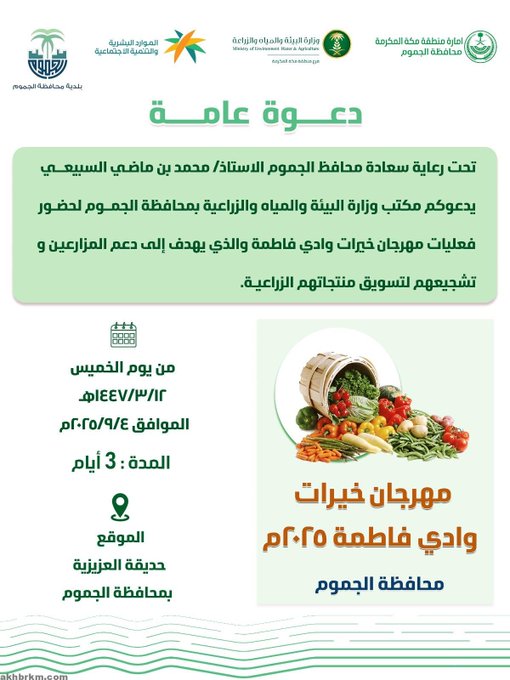 تنطلق يوم الخميس القادم فعاليات مهرجان خيرات وادي فاطمة 2025 الذي ينظمه مكتب وزارة البيئة والمياه والزراعة بمحافظة الجموم التابعة لمنطقة مكة المكرمة.