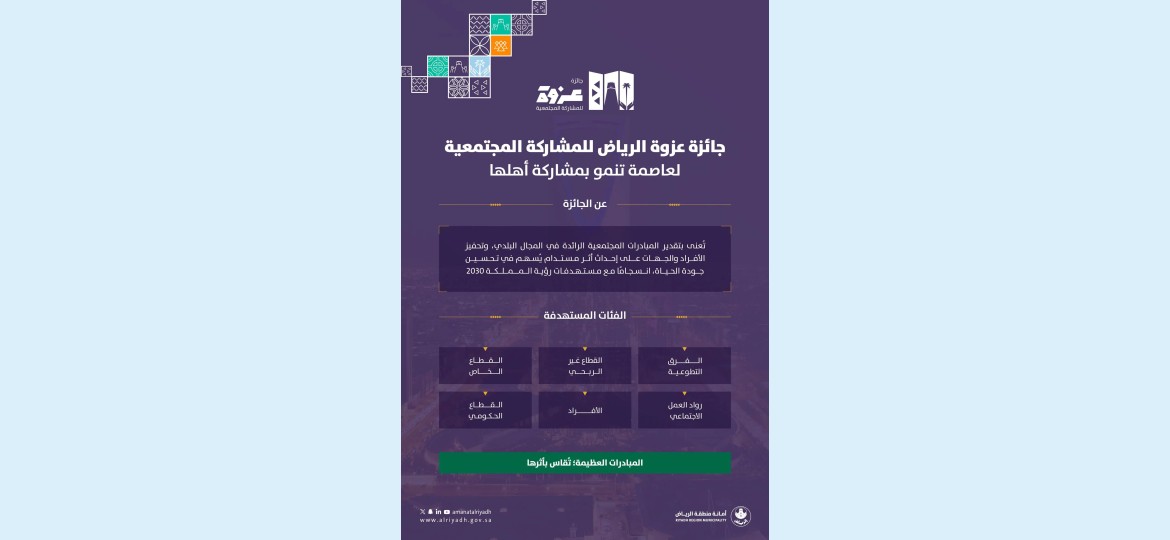 وتأتي جائزة "عزوة" ضمن جهود أمانة منطقة الرياض لتوسيع نطاق المشاركة المجتمعية، وبناء شراكات فاعلة بين مختلف القطاعات، بما يسهم في تحسين جودة الحياة، امتدادًا لرؤيتها في أن تكون أمانة رائدة لمدينة مزدهرة ومستدامة ترتقي بجودة الحياة، ورسالتها في تعزيز التنمية الحضرية وتوفير خدمات عالية الجودة عبر شراكات فاعلة نحو مجتمع نابض بالحياة.