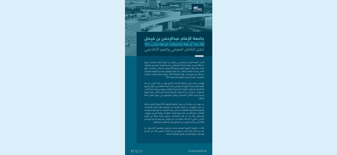 أعلنت جامعة الإمام عبد الرحمن بن فيصل عن اعتماد أربعة تخصصات فرعية (Minor) جديدة، تشمل: الذكاء الاصطناعي، الصحة العامة، المحاسبة، والمالية، وذلك ضمن إطار سعيها لتطوير برامجها الأكاديمية بما يواكب متطلبات سوق العمل، ويدعم تطلعات الطلاب نحو تنمية مهاراتهم وتوسيع آفاقهم المعرفية، انسجامًا مع مستهدفات رؤية المملكة 2030 وبرنامج تنمية القدرات البشرية، المتضمنة “مبادرة الدرجات العلمية المخصصة ذاتيًا”.