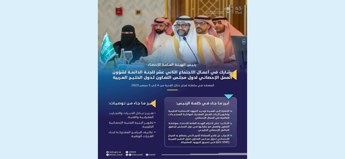 شارك رئيس  الهيئة العامة للإحصاء  فهد بن عبدالله الدوسري، في أعمال الاجتماع الثاني عشر للجنة الدائمة لشؤون العمل الإحصائي لدول مجلس التعاون لدول الخليج العربية، الذي استضافته سلطنة عُمان خلال الفترة من 4 إلى 5 سبتمبر 2025م.