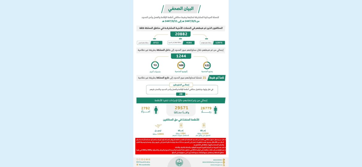 أسفرت  الحملات الميدانية  المشتركة لمتابعة وضبط مخالفي أنظمة الإقامة والعمل وأمن الحدود، التي تمت في مناطق المملكة كافة، وذلك للفترة من 5 حتى 11 / 3 / 1447هـ الموافق من 28 / 8 حتى 3 / 9 / 2025م عن النتائج التالية: