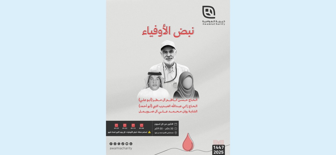 يذكر أن جمعية العوامية الخيرية تقيم بشكل أسبوعي مبادرتها المجتمعية للتبرع بالدم في مستشفى الأمير محمد بن فهد، حيث أصبح الركن منصة إنسانية ثابتة تتيح لأفراد المجتمع فرصة المساهمة المباشرة في إنقاذ الأرواح وتلبية احتياجات المستشفيات من وحدات الدم. ومع إطلاق مبادرة "نبض الأوفياء"، تضيف الجمعية بعدًا إنسانيًا جديدًا يعزز ثقافة العطاء والوفاء، ويحوّل التبرع بالدم إلى رسالة أمل ممتدة تحمل في طياتها معنى التكافل والإخلاص لأبناء الجمعية الذين أفنوا أعمارهم في خدمة المجتمع.