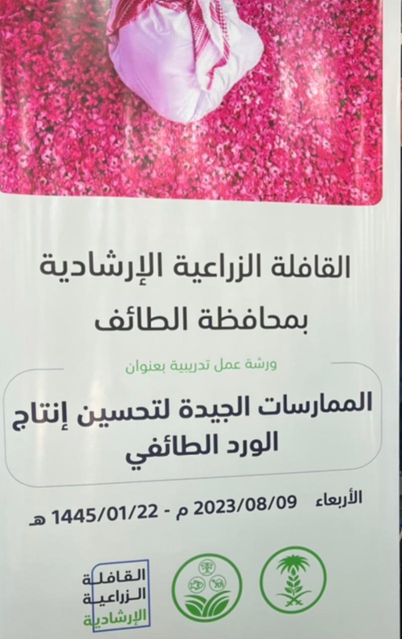 مع انطلاق فعاليات أكبر قافلة زراعية إرشادية على مستوى العالم والتي ستجوب 27 مدينة بالمملكة أقام مصنع القرشي للعطور  بالهدا  اليوم ورشة  الممارسات الجيدة لتحسين إنتاج  الورد الطائفي  ضمن فعاليات  القافلة الزراعية الارشادية قبل انطلاقها  غدا بمحافظة  الطائف والتي ستشتمل   على مسيرة بالهجن والسيارات الرسمية احتفاء  بوصول القافلة الزراعية الارشادية لمحافظة الطائف وتأكيدًا على أهمية دورها في تنمية القطاع الزراعي بالمحافظة بحضور  مدير  مكتب وزارة البيئة والمياه والزراعة بمحافظة الطائف المهندس هاني القاضي وعدد من المسؤولين والوجهاء والمختصين بالورد الطائفي