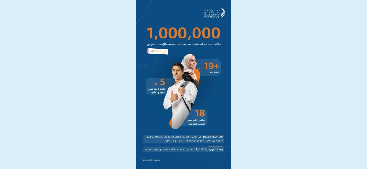 استمرارًا لجهود صندوق تنمية الموارد البشرية في تمكين الكفاءات الوطنية وإعدادها للمستقبل وتقليل الفجوة بين مهاراتها ومستقبل سوق العمل، كشف الصندوق عن استفادة مليون طالب وطالبة في المرحلة الثانوية من مبادرة التوجيه والإرشاد المهني في المدارس، بمختلف مناطق المملكة، وذلك منذ إطلاق المبادرة في سبتمبر 2023م، وحتى نهاية شهر مايو الماضي 2025.