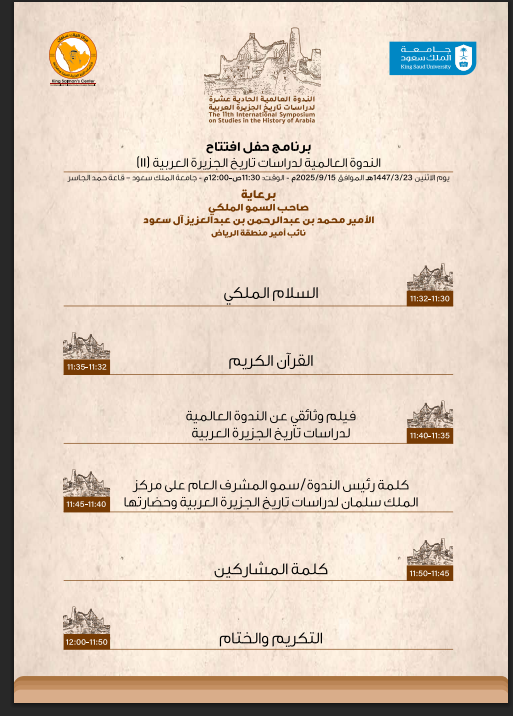وسيتضمن برنامج حفل الافتتاح السلام الملكي وتلاوة آيات من القرآن الكريم، يليهما عرض فيلم وثائقي عن الندوة، ثم كلمة سمو المشرف العام على مركز الملك سلمان لدراسات تاريخ الجزيرة العربية وحضارتها، إضافة إلى كلمة المشاركين، ليُختتم الحفل بتكريم المشاركين والتقاط الصور التذكارية.