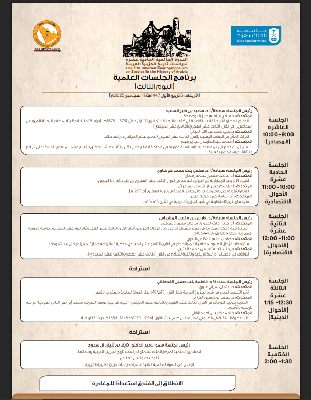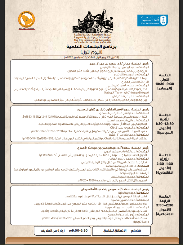 تستعد جامعة الملك سعود ممثلة في مركز الملك سلمان لدراسات تاريخ الجزيرة العربية وحضارتها، لانطلاق أعمال الندوة العالمية لدراسات تاريخ الجزيرة العربية (الحادية عشرة)، وذلك يوم الاثنين 23 / 7 / 1447هـ الموافق 15 / 9 / 2025م، في قاعة الشيخ حمد الجاسر بالجامعة، برعاية صاحب السمو الملكي الأمير محمد بن عبدالرحمن بن عبدالعزيز آل سعود نائب أمير منطقة الرياض.