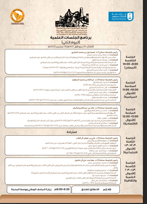 وتأتي هذه الندوة في نسختها الحادية عشرة امتدادًا لسلسلة من اللقاءات العلمية التي تجمع نخبة من الباحثين والمتخصصين من مختلف أنحاء العالم، بهدف دراسة تاريخ الجزيرة العربية وإبراز عمقها الحضاري ودورها التاريخي.
