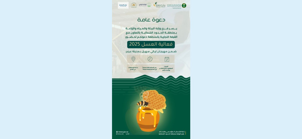 يستعد فرع وزارة البيئة والمياه والزراعة بمنطقة الحدود الشمالية بالتعاون مع الغرفة التجارية بالمنطقة لإطلاق فعالية العسل 2025 يوم السبت القادم 13 سبتمبر 2025م، وذلك ضمن فعاليات مهرجان ليالي سهيل بمدينة عرعر، حيث ستستمر الفعالية لمدة أربعة أيام بساحة الاحتفالات في حي الرفاع.