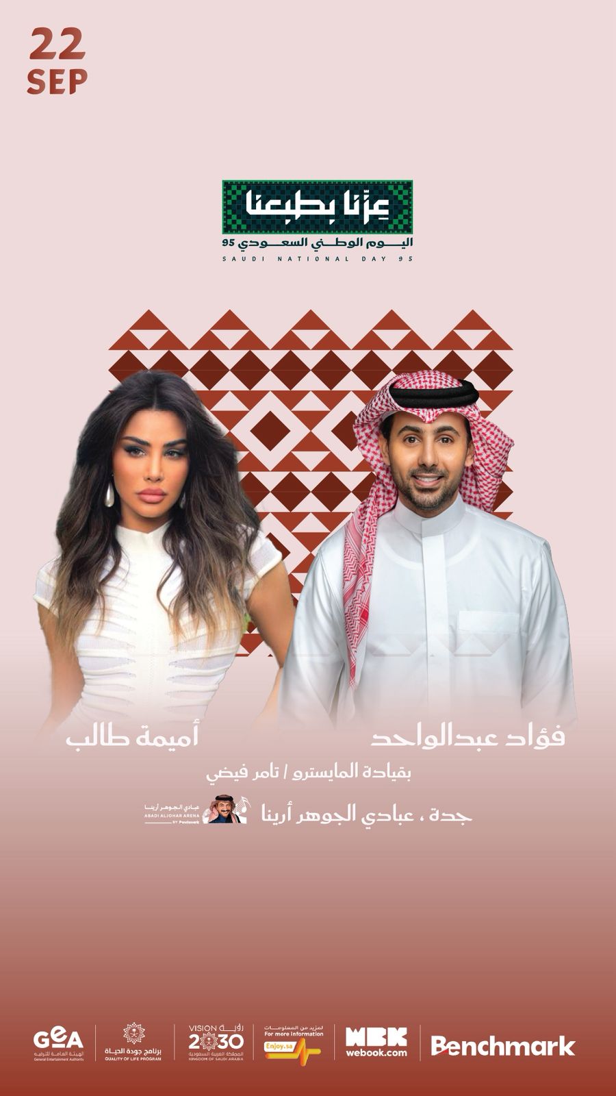 احتفاءً باليوم الوطني السعودي الـ 95 تحت شعار “عزّنا بطبعنا”، أعلنت شركة بنش مارك عن تنظيم ثلاث حفلات غنائية كبرى تجمع بين الطرب الأصيل والحماس الجماهيري في جدة والشرقية والقصيم.