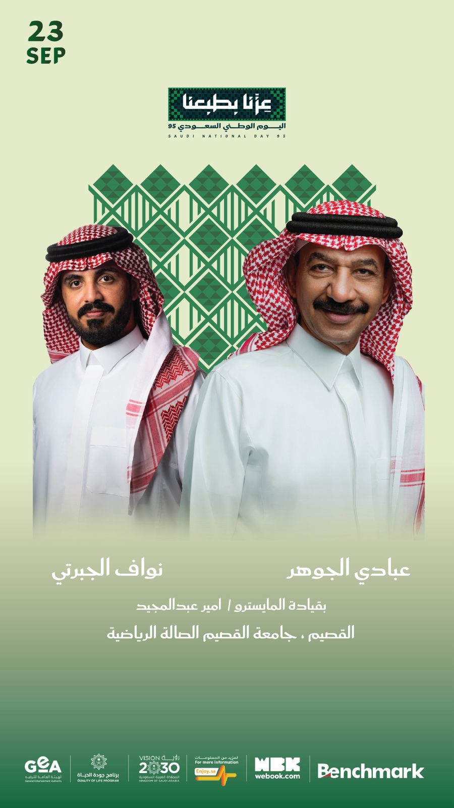 ويوم 23 سبتمبر، تحط الحفلات رحالها في القصيم، حيث يجتمع عشاق الطرب مع الموسيقار الكبير عبادي الجوهر الذي يطرب الآذان بعزفه وغنائه الراقي، إلى جانب الفنان نواف الجبرتي الذي يضفي لمسة شبابية حديثة على الأمسية، وذلك في الصالة الرياضية بجامعة القصيم.