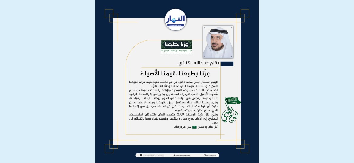 عِزّنا بطبعنا يتجلى في ثباتنا على الحق، ووفائنا لوطننا وقيادتنا، وفي سعينا الدائم لبناء مستقبل يليق بتاريخنا. ومنذ 95 عامًا ونحن نثبت أن قوة هذه البلاد ليست في ثرواتها فحسب، بل في إنسانها الذي يصنع الفارق بعزيمته وقيمه.