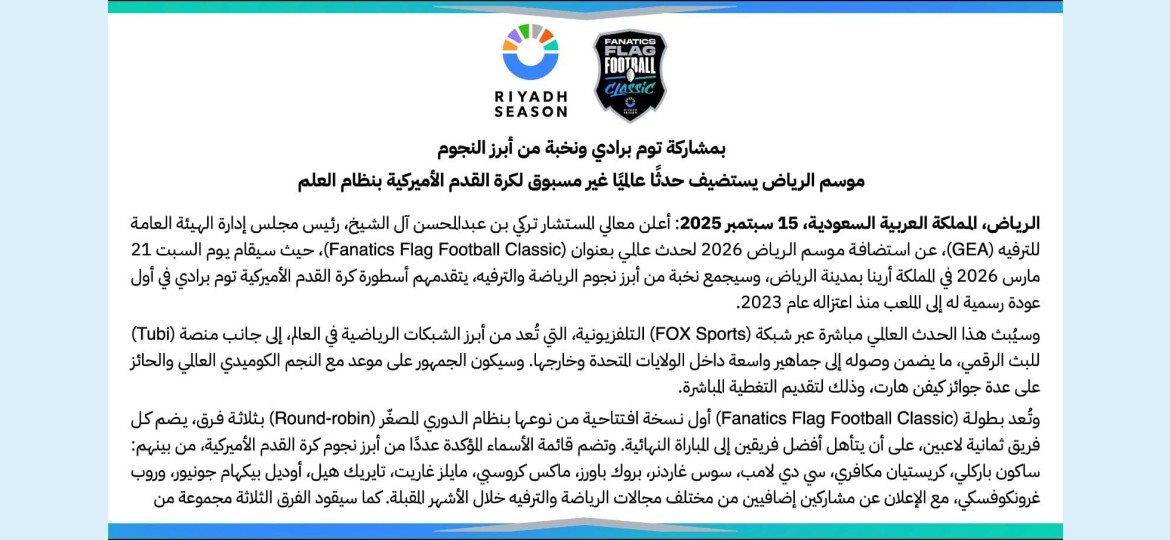 أعلن المستشار تركي آل الشيخ، رئيس مجلس إدارة الهيئة العامة للترفيه، عن استضافة المملكة العربية السعودية لأول مرة بطولة كرة القدم الأمريكية بنظام العلم ضمن فعاليات موسم الرياض 2026.