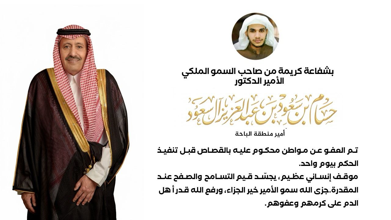 بشفاعة كريمة من صاحب السمو الملكي الأمير الدكتور حسام بن سعود بن عبدالعزيز، أمير منطقة الباحة، تم العفو عن أحد المواطنين المحكوم عليه بالقصاص، وذلك قبل يوم واحد من الموعد المحدد لتنفيذ الحكم، بعد لقاء سموه بأولياء دم المجني عليه في ديوان الإمارة.