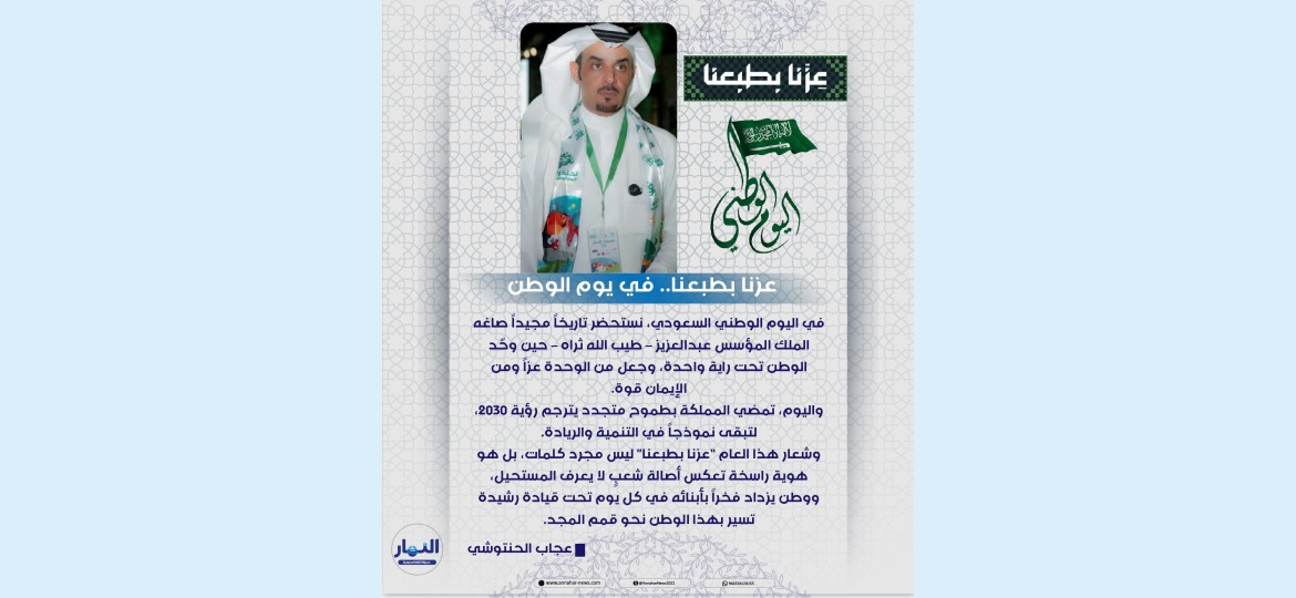 وشعار هذا العام “عزنا بطبعنا” ليس مجرد كلمات، بل هو هوية راسخة تعكس أصالة شعبٍ لا يعرف المستحيل، ووطن يزداد فخراً بأبنائه في كل يوم تحت قيادة رشيدة تسير بهذا الوطن نحو قمم المجد.